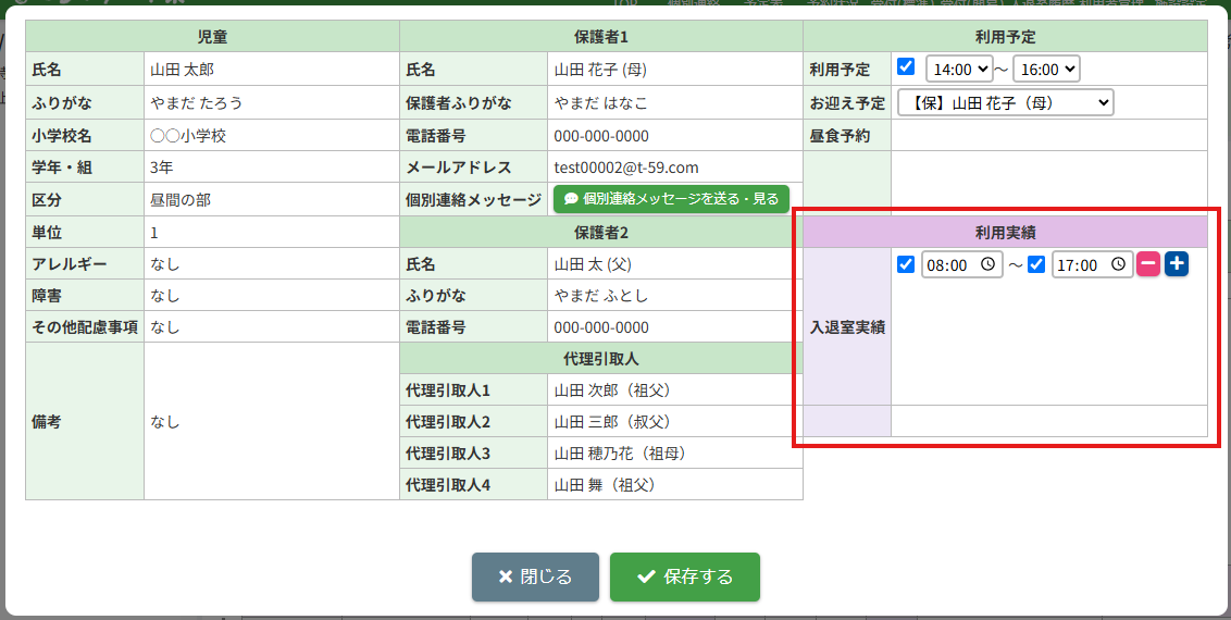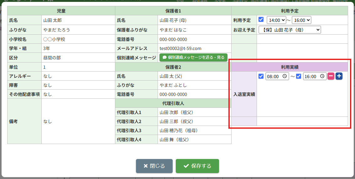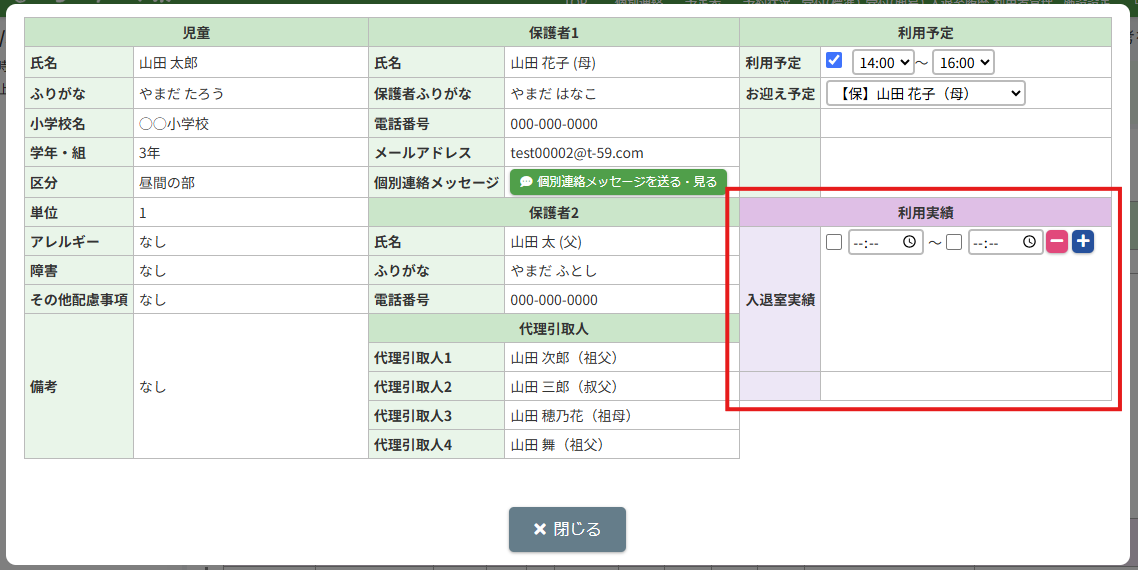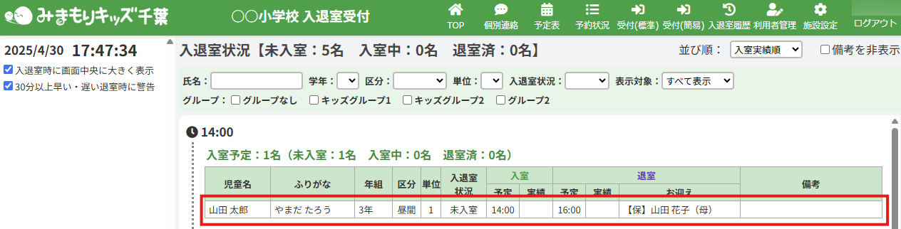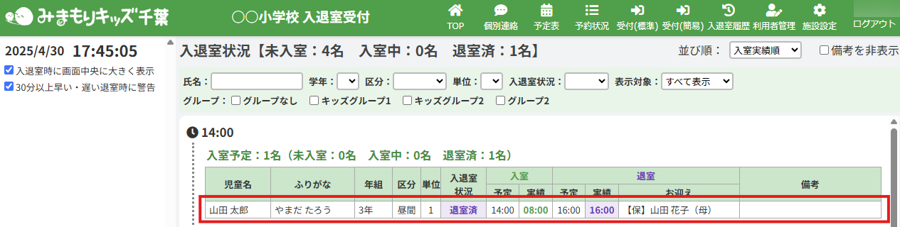 4.変更内容に応じた「入室」欄、「退室」欄の実績が変更されていることを確認してください。