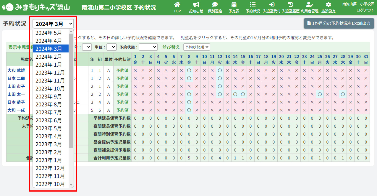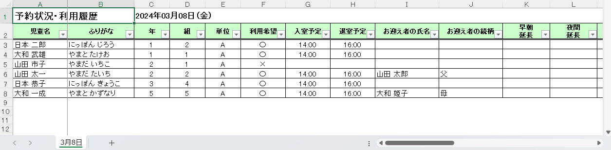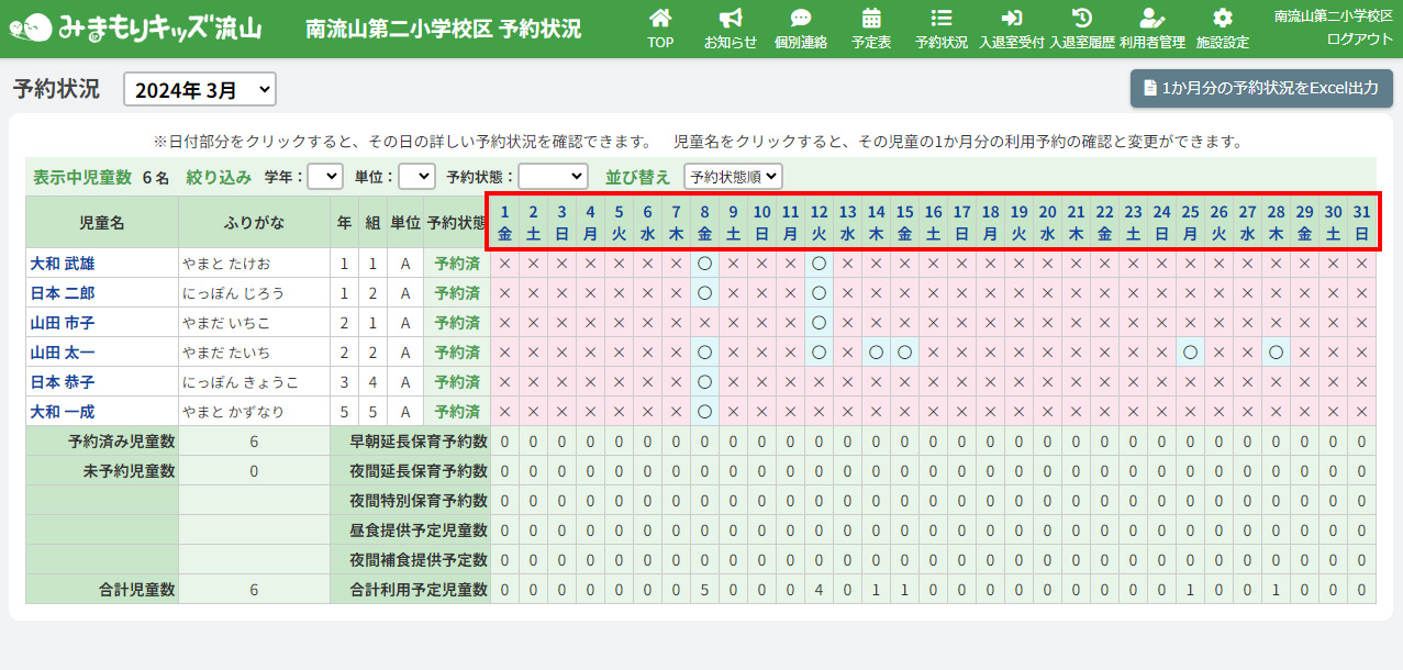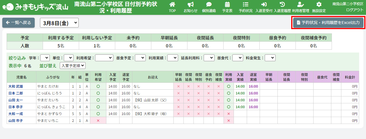 HOME > 予約状況 > 日付別予約状況・利用履歴を出力する 日付別予約状況・利用履歴を出力する 「日付別予約状況・利用履歴を出力する」では、日付別の詳細な利用予約と利用履歴の一覧をExcel形式で出力する機能の確認ができます。 1.日付別予約状況・利用履歴を出力したい月を選択する 予約状況・利用履歴を出力したい月を選択してください。 2.日付別予約状況確認ページを開く 予約状況の一覧から、予約状況・利用履歴を出力したい日付をクリックしてください。 3.日付別予約状況・利用履歴の出力を実行する 画面右上の【予約状況・利用履歴をExcel出力】ボタンをクリックしてください。 4.出力されたExcelデータを開く 出力されたデータが自動でダウンロードされます。ダウンロードファイルをクリックしてExcelデータを開いてください。 予約状況と利用履歴がまとまった表になり、出力されます。データの管理や印刷の際にお使いください。 1カ月分の予約状況を出力する ≫