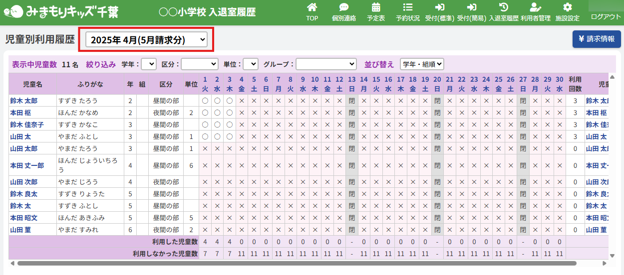 児童が施設を利用した実績のことです。画面上部の【入退室履歴】をクリックすると当月の入退室履歴一覧を表示します。