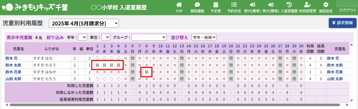 ここでは、1か月分の入退室履歴の確認方法や、一覧表示の並び替え・特定児童のみを表示させる機能の確認ができます。