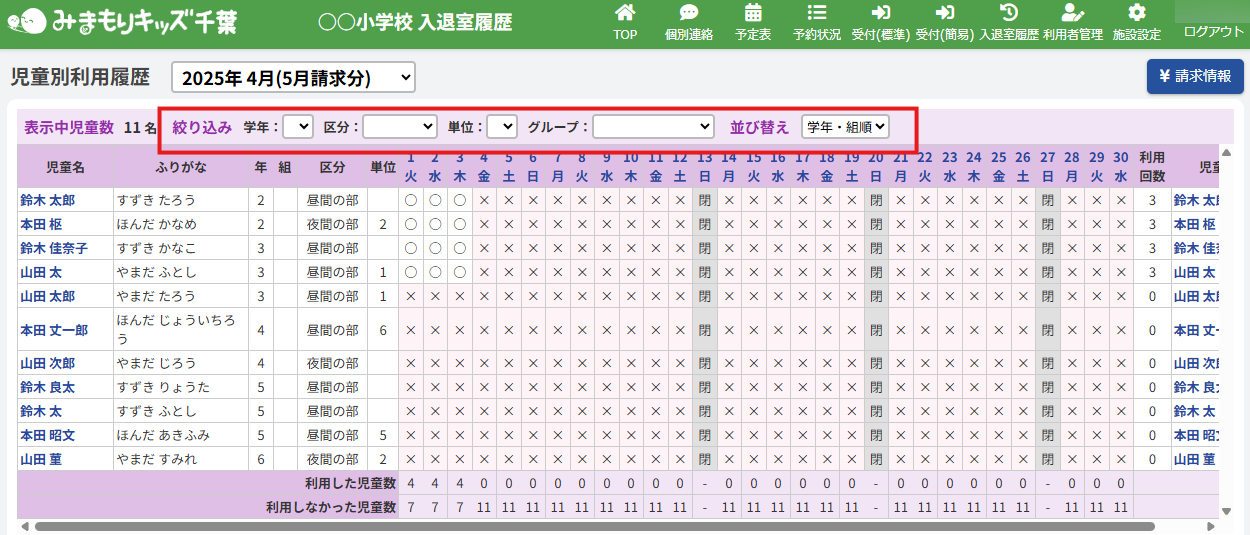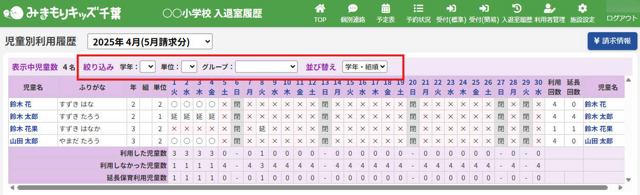 一覧の中から特定の児童を探すための絞り込み機能があります。