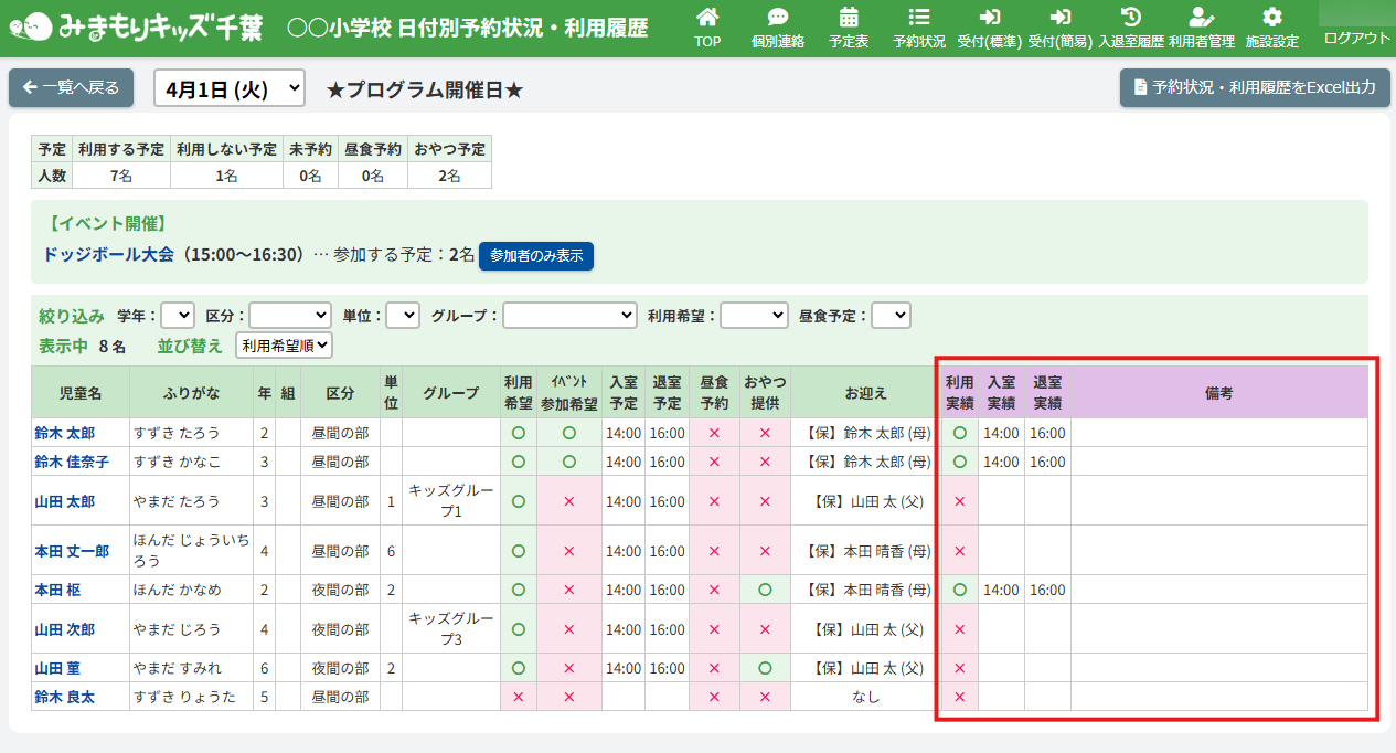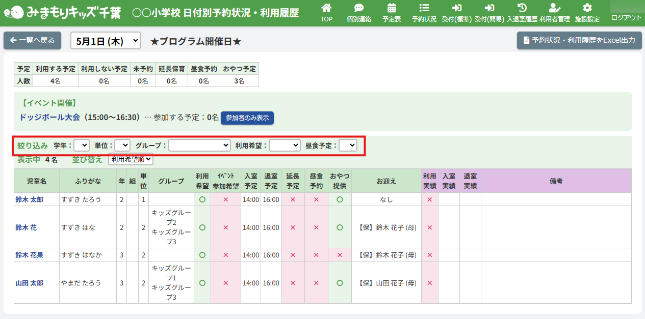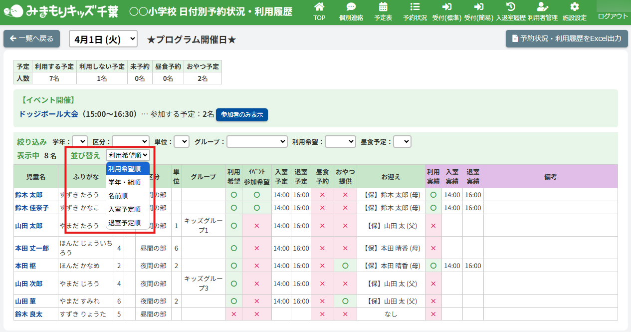 利用希望の有(〇)・無(×)で児童を並び替えて表示します。
