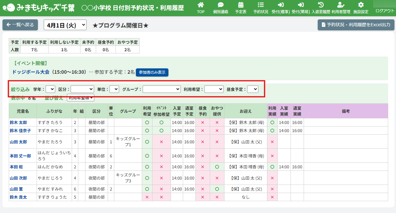 一覧の中から特定の児童を探すための絞り込み機能があります。