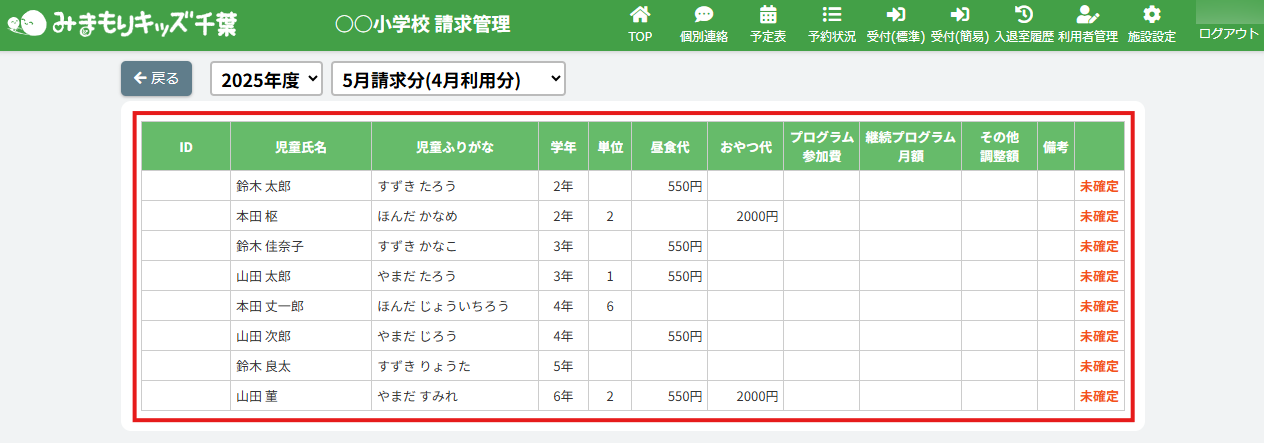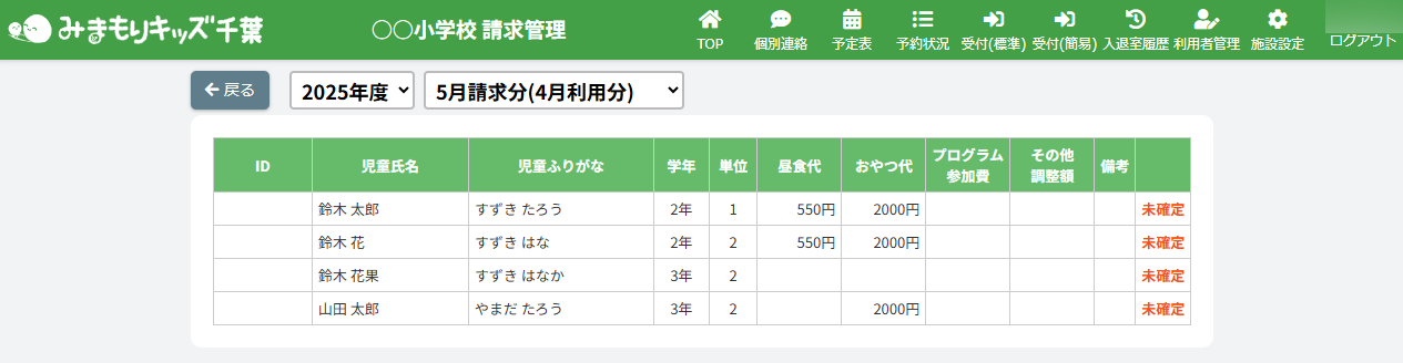 HOME > 入退室履歴 > 請求金額を確認する 請求情報を確認する 「請求情報を確認する」とは… 月ごとの請求情報を確認することができる機能です。 指定した月の請求情報を確認するには、その月の前月の利用料を確定する必要があります。 (例:5月分の請求情報を確認するには、4月の利用料を確定する必要があります。) 利用料を確定する方法はこちらをご確認ください。 ここでは、請求情報を確認する機能や、児童毎の請求情報を確認する機能の確認ができます。 1.請求情報画面を開く 入退室履歴画面の右上にある【請求情報】ボタンを押してください。 2.請求情報を確認したい年度と月を選択する 画面左上にある年度リストと月リストから確認したい年月度を選択してください。 3.請求情報を確認する 年度と月を選択することで、請求情報を確認することができます。 ※選択した月の前月の利用料を確定していないと請求情報は表示されません。利用料を確定する方法はこちらをご覧ください。 <子どもルームでの画面表示> 4.児童毎の請求情報を確認する 確認したい児童の行をクリックすることで、児童毎の請求情報を確認することができます。 請求金額を編集する ≫