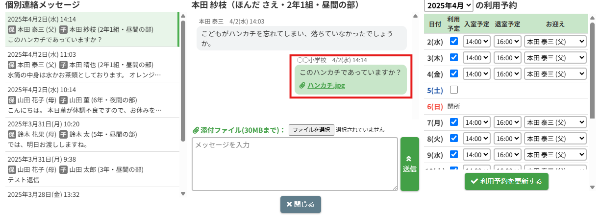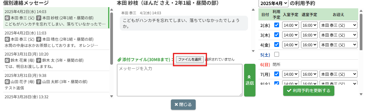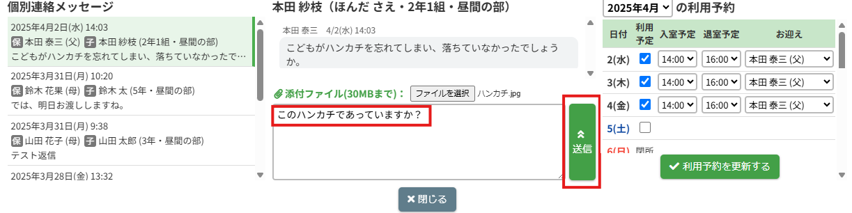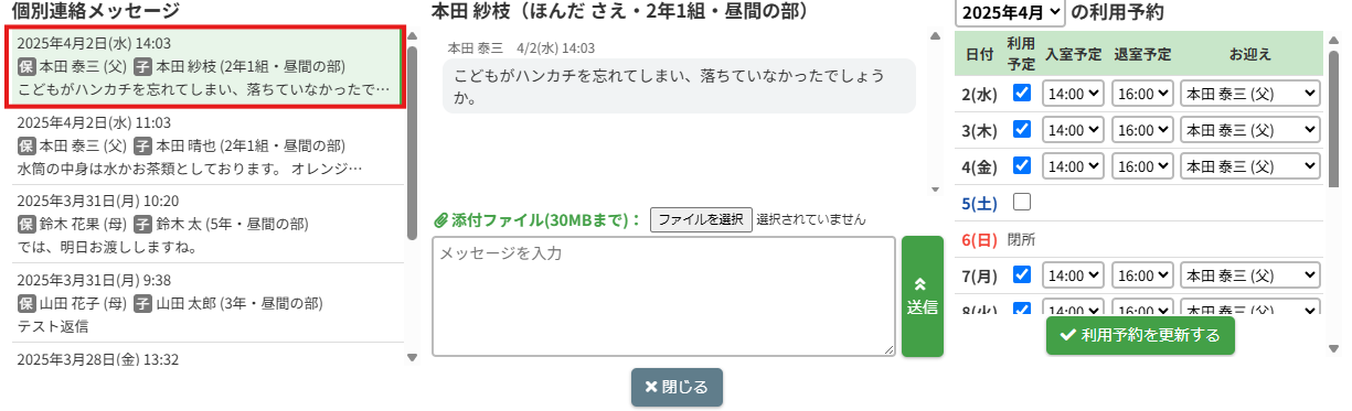 【個別連絡】ボタンをクリックすると個別連絡メッセージがポップアップで表示されます。