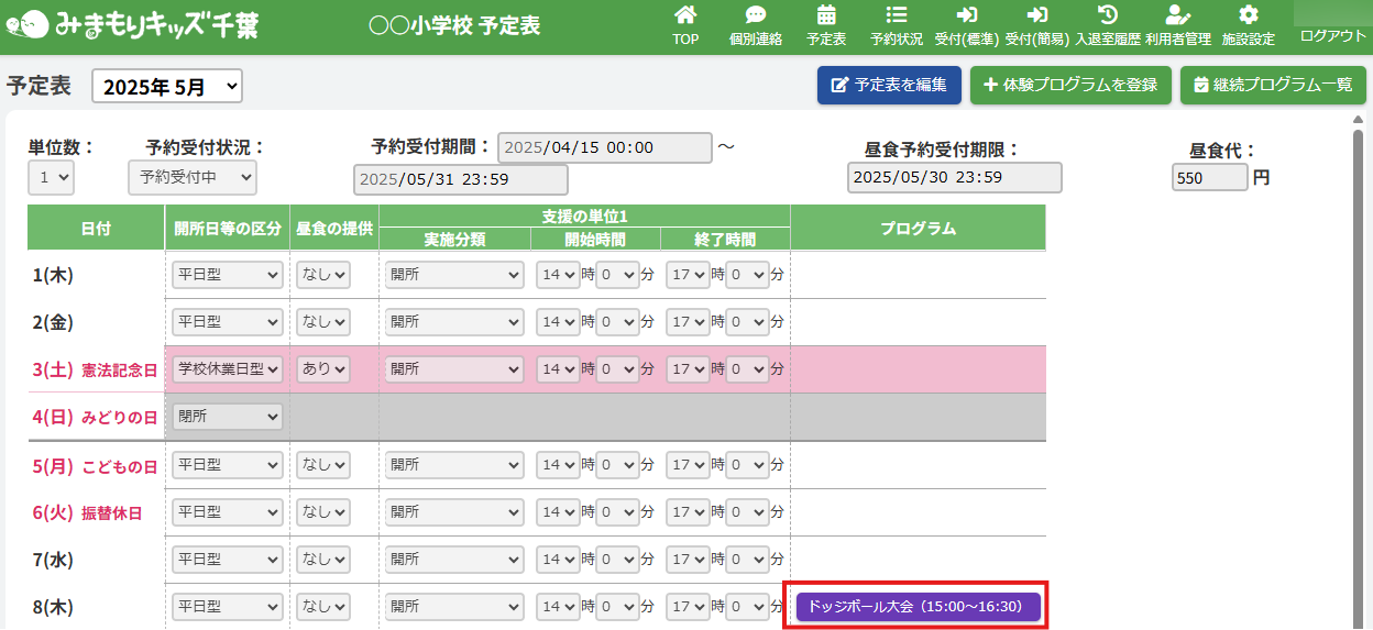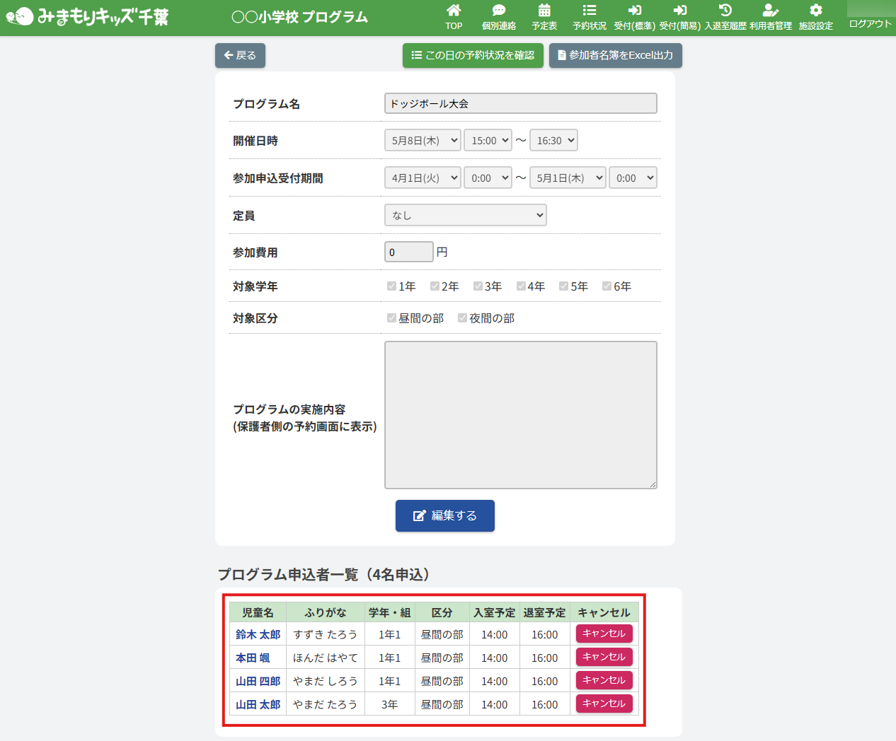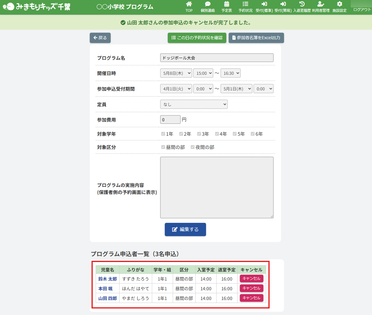 HOME > 予定表 > 体験プログラム申込者のキャンセルを行う(アフタースクール) 体験プログラム申込者のキャンセルを行う(アフタースクール) 「体験プログラム申込者のキャンセルを行う」では、プログラムに申し込んだ児童のキャンセルを施設側で編集する機能の確認ができます。※プログラム「定員」でいずれかを選択すると、表記がそれぞれ異なります。定員制限が無く、プログラム「定員」で「なし」を選択した場合、【編集する】ボタンは表示されず、児童のキャンセルのみが可能になります。 1.体験プログラム内容の確認画面を開く プログラムを登録した日にちのカレンダー欄から【プログラム名称】ボタンをクリックしてください。(例:ドッジボール大会) 体験プログラム:紫のボタン継続プログラム:オレンジのボタン 2.体験プログラム申込者の更新を行う 画面下部にある「プログラム申込者一覧」で児童のキャンセルを行うことができます。キャンセルしたい児童を選び、 【キャンセル】ボタンをクリックしてください。 3.プログラム申込者のキャンセルを完了する 画面上部に表示されるアナウンスとプログラム申込者の人数が更新されていることをご確認ください。 体験プログラムの自動締切を設定する(アフタースクール)≫