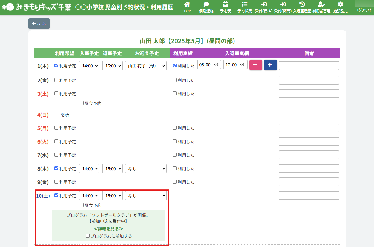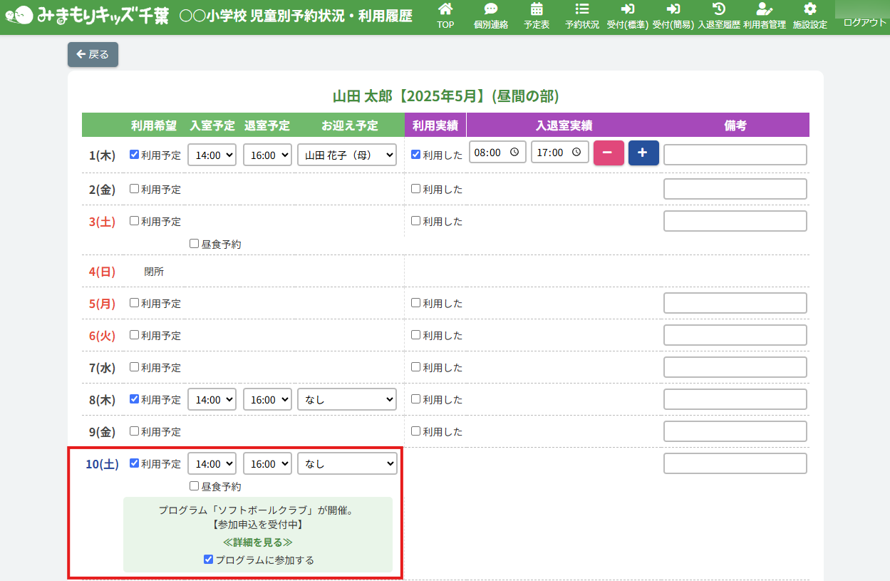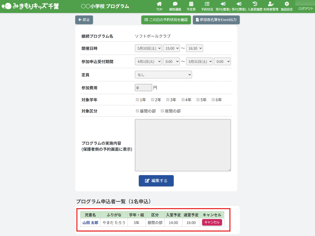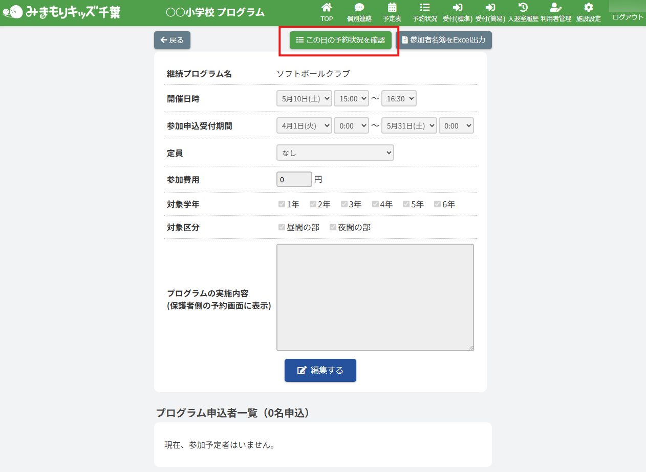 HOME > 予定表 > 継続プログラム申込者の申込状況を編集する(アフタースクール) 継続プログラム申込者の申込状況を編集する(アフタースクール) 「継続プログラム申込者の申込状況を更新する」では、登録したプログラムへの児童ごとの参加・不参加を 施設側の「日付別利用状況・利用履歴」で編集・更新する機能の確認ができます。 1.継続プログラム内容の確認画面を開く 継続プログラムを登録した日にちのカレンダー欄から【継続プログラム名称】ボタンをクリックしてください。(例:ソフトボールクラブ) 体験プログラム:紫のボタン継続プログラム:オレンジのボタン 2.日付別予約状況の確認画面を開く 画面上部にある【この日の予約状況を確認】ボタンをクリックしてください。 3.プログラム申込状況を変更したい児童の予約状況を開く 一覧の中から、プログラムの申込状況(予約状況)を更新したい児童の名前をクリックしてください。 4.児童別予約状況を更新する 内容の更新をしたい欄を項目に沿って入力、選択してください。プログラムへの参加・不参加もこちらで選択ができます。 5.更新を保存する 【上記内容で更新する】ボタンをクリックして更新を保存してください。 6.更新の完了 画面上部に表示されるアナウンスと予約状況画面が更新されていることをご確認ください。 プログラム詳細画面でも、児童のプログラム申込状況が確認できます。 継続プログラム参加者名簿を出力する(アフタースクール)≫