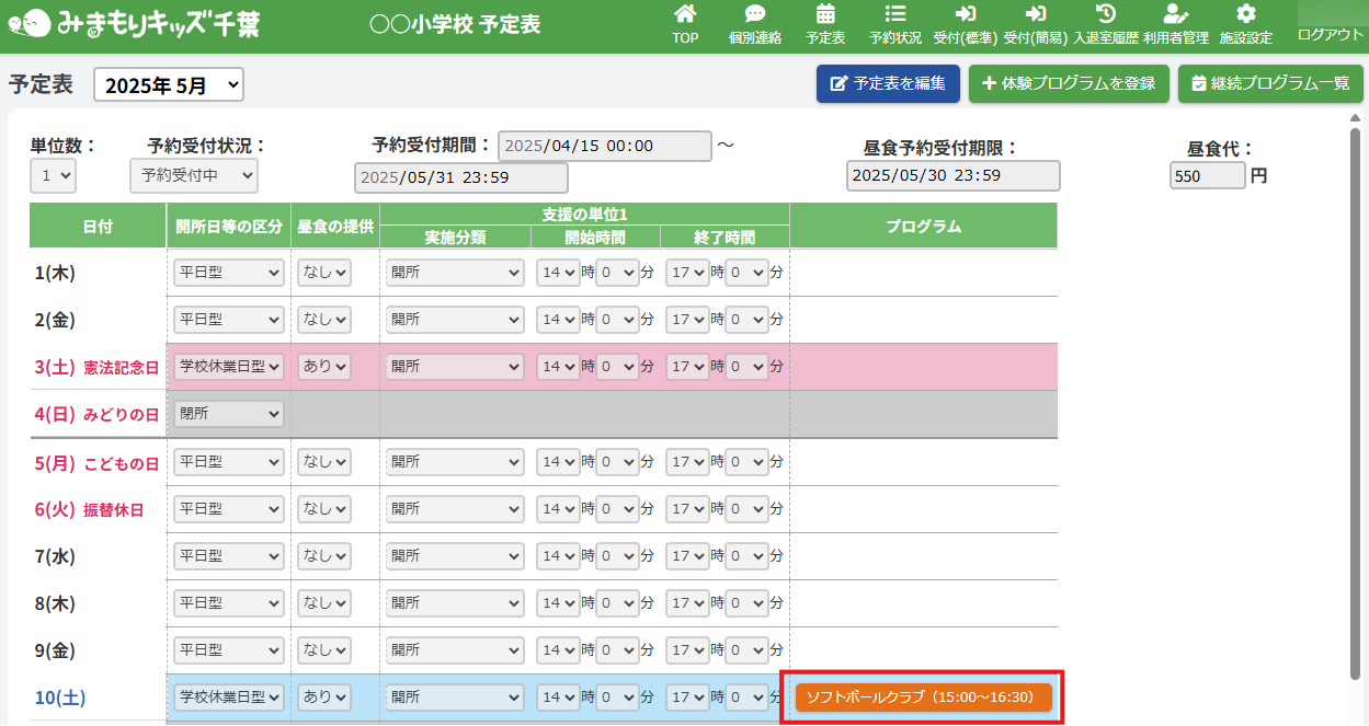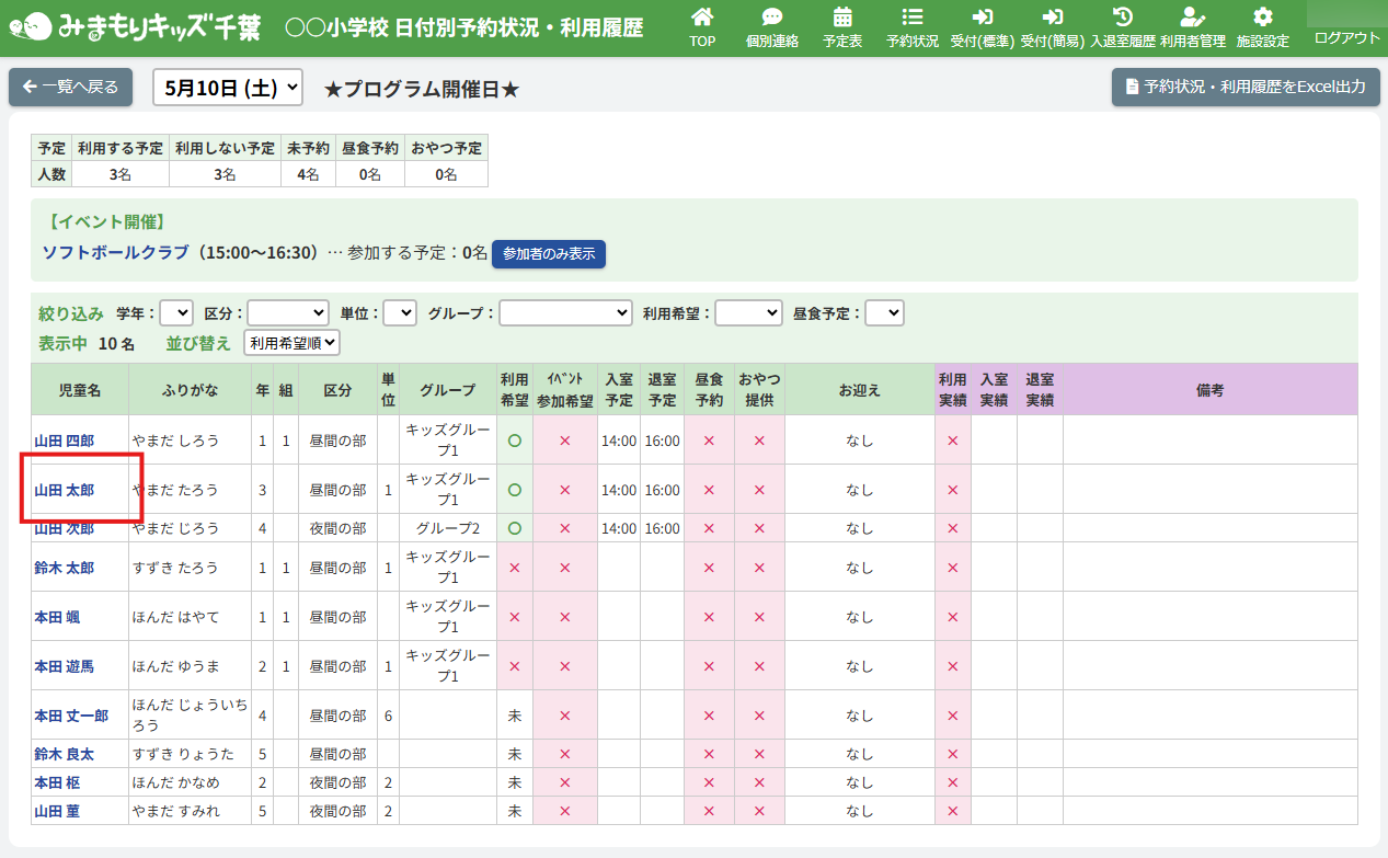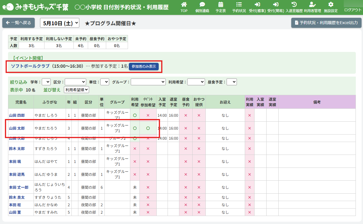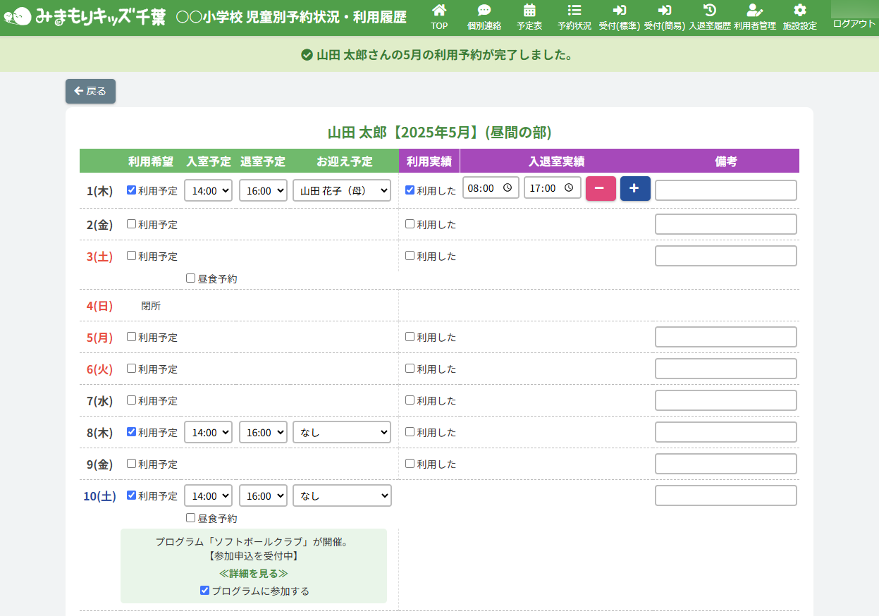 HOME > 予定表 > 継続プログラム申込者の申込状況を編集する(アフタースクール) 継続プログラム申込者の申込状況を編集する(アフタースクール) 「継続プログラム申込者の申込状況を更新する」では、登録したプログラムへの児童ごとの参加・不参加を 施設側の「日付別利用状況・利用履歴」で編集・更新する機能の確認ができます。 1.継続プログラム内容の確認画面を開く 継続プログラムを登録した日にちのカレンダー欄から【継続プログラム名称】ボタンをクリックしてください。(例:ソフトボールクラブ) 体験プログラム:紫のボタン継続プログラム:オレンジのボタン 2.日付別予約状況の確認画面を開く 画面上部にある【この日の予約状況を確認】ボタンをクリックしてください。 3.プログラム申込状況を変更したい児童の予約状況を開く 一覧の中から、プログラムの申込状況(予約状況)を更新したい児童の名前をクリックしてください。 4.児童別予約状況を更新する 内容の更新をしたい欄を項目に沿って入力、選択してください。プログラムへの参加・不参加もこちらで選択ができます。 5.更新を保存する 【上記内容で更新する】ボタンをクリックして更新を保存してください。 6.更新の完了 画面上部に表示されるアナウンスと予約状況画面が更新されていることをご確認ください。 プログラム詳細画面でも、児童のプログラム申込状況が確認できます。 継続プログラム参加者名簿を出力する(アフタースクール)≫