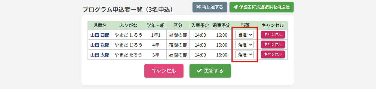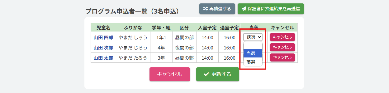 参加(当選)・不参加(落選)を施設側で編集・更新する機能の確認ができます。