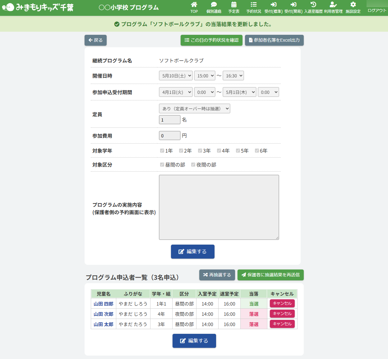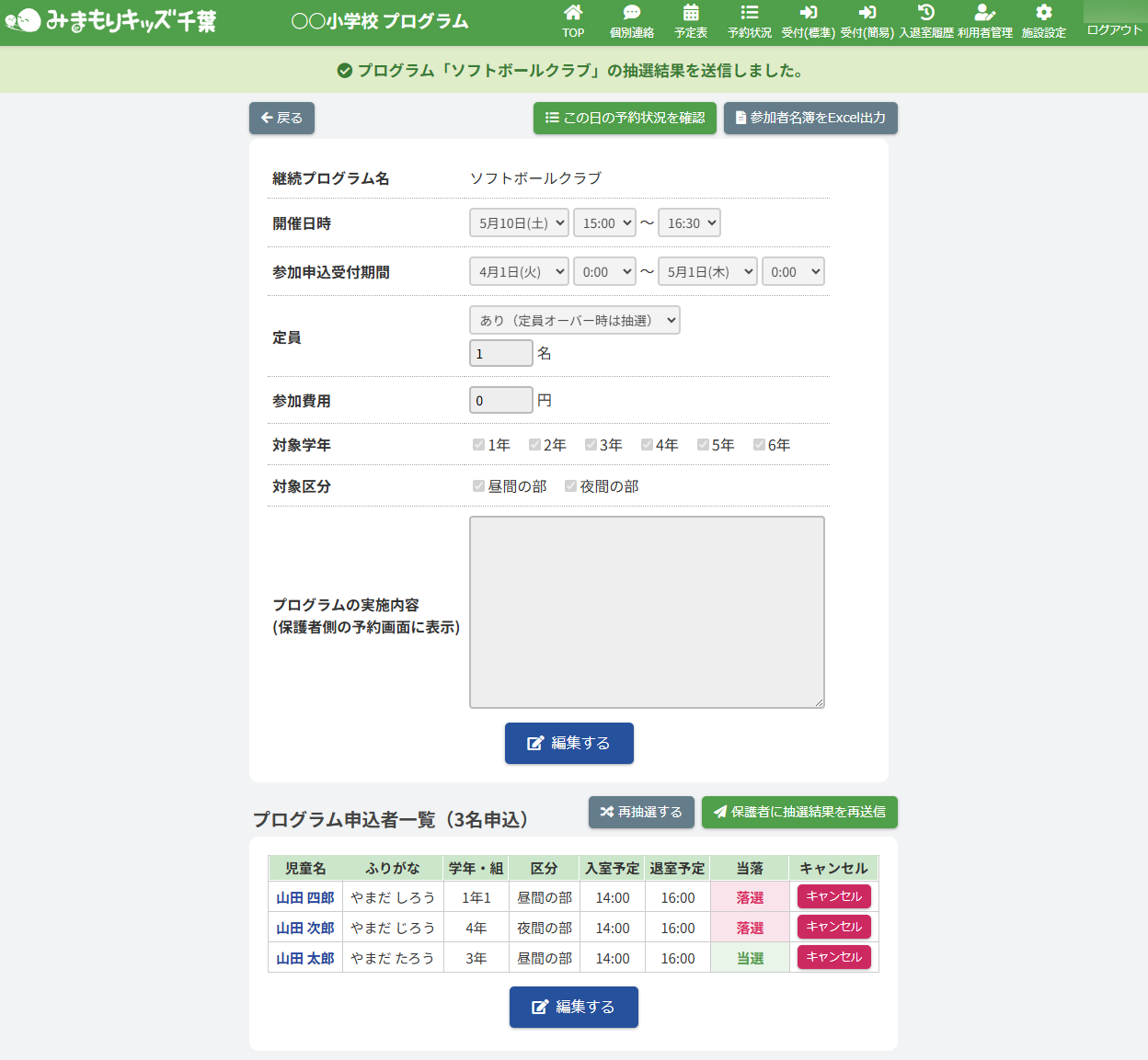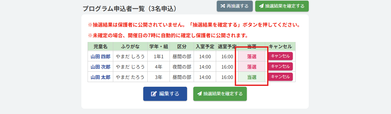 抽選結果が確定され、保護者に抽選結果が送信されます。また画面上部に表示されるアナウンスをご確認ください。