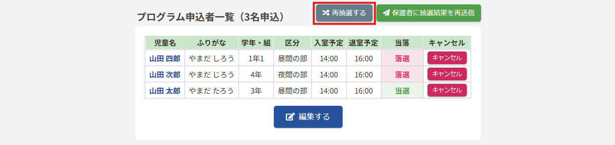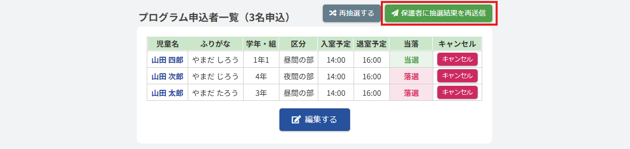 プログラム参加予定者一覧の右上にある【保護者に抽選結果を再送信】ボタンを押すことで再送信が行われます。