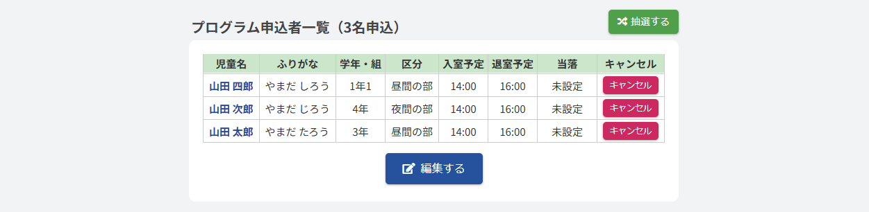 継続プログラム申込者一覧の右上にある【抽選する】ボタンを押すことで抽選が行われます。