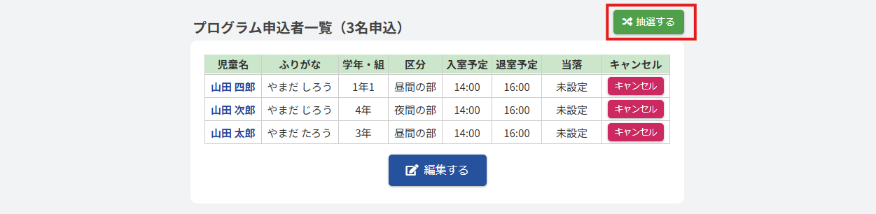 手動で抽選を行うこともできます。抽選を行う際は、【編集する】ボタンをクリックしてください。