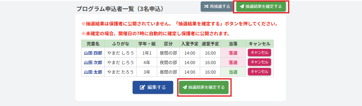 現時点で抽選結果は保護者に公開されていません。抽選結果を確定する際は、【抽選結果を確定する】ボタンを押してください。