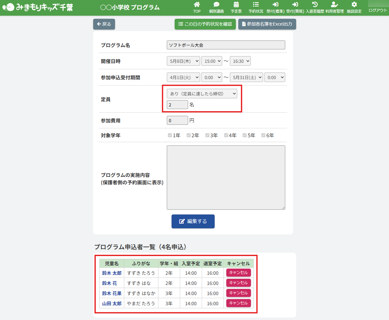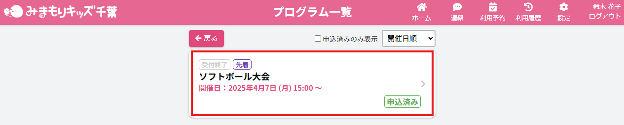 定員に達した際は、保護者側の利用予約入力画面・プログラム一覧画面にて確認ができます。