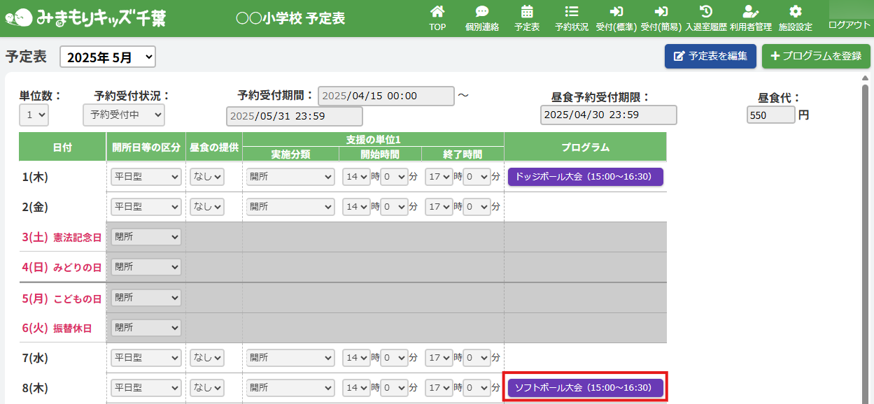 プログラムを登録した日にちのカレンダー欄から【プログラム名称】ボタンをクリックしてください。(例:ソフトボール大会)
