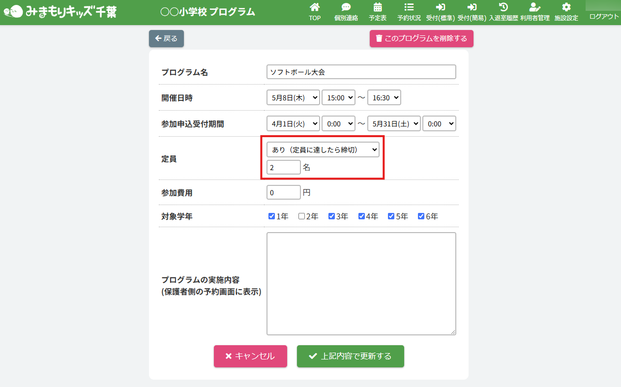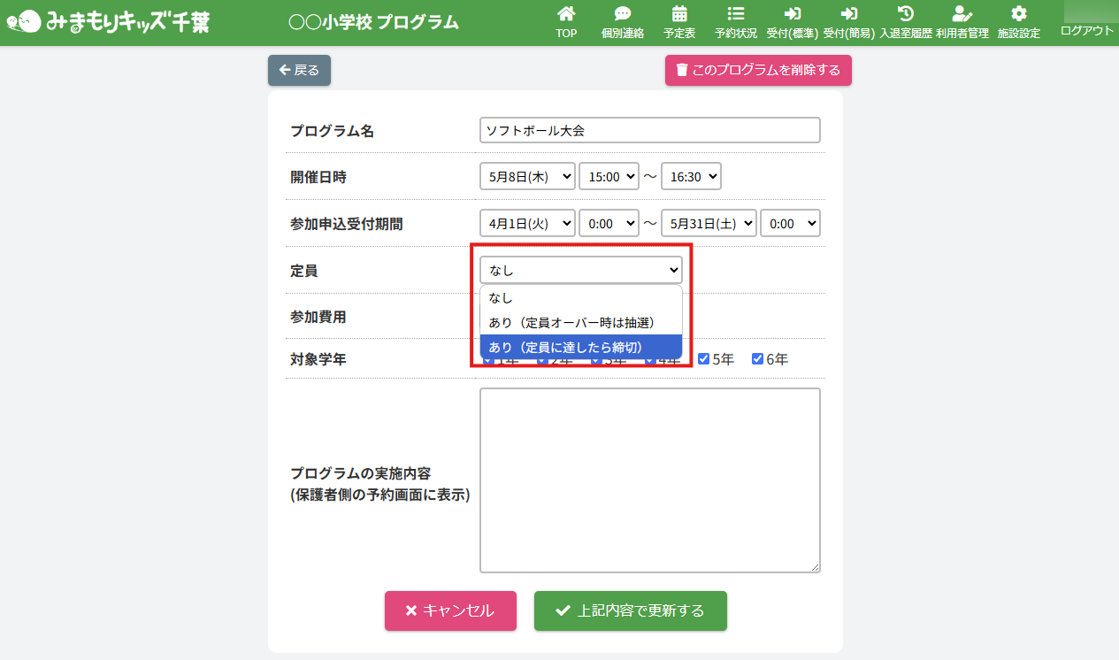 プログラム詳細「定員」の【あり(定員に達したら締切)】を選択し、定員数を設定してください。