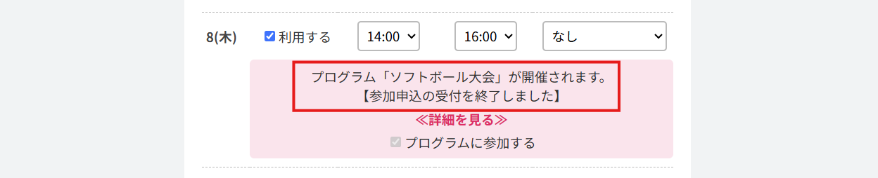 プログラムが締め切られると、利用予約入力画面で、プログラムに「【参加申込の受付を終了しました】」と表記されます。