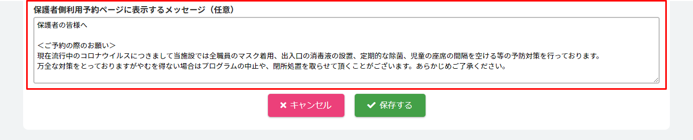 11.保護者側利用予約ページに表示するメッセージを入力する