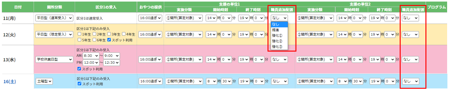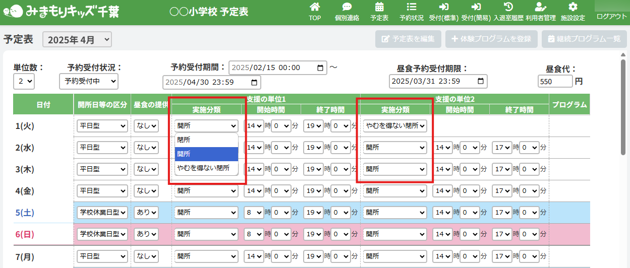 (平日・土曜日に閉所する場合は、全ての支援の単位の実施分類にて「③閉所(算定対象)」または「④閉所(算定対象外)」を選択してください。)