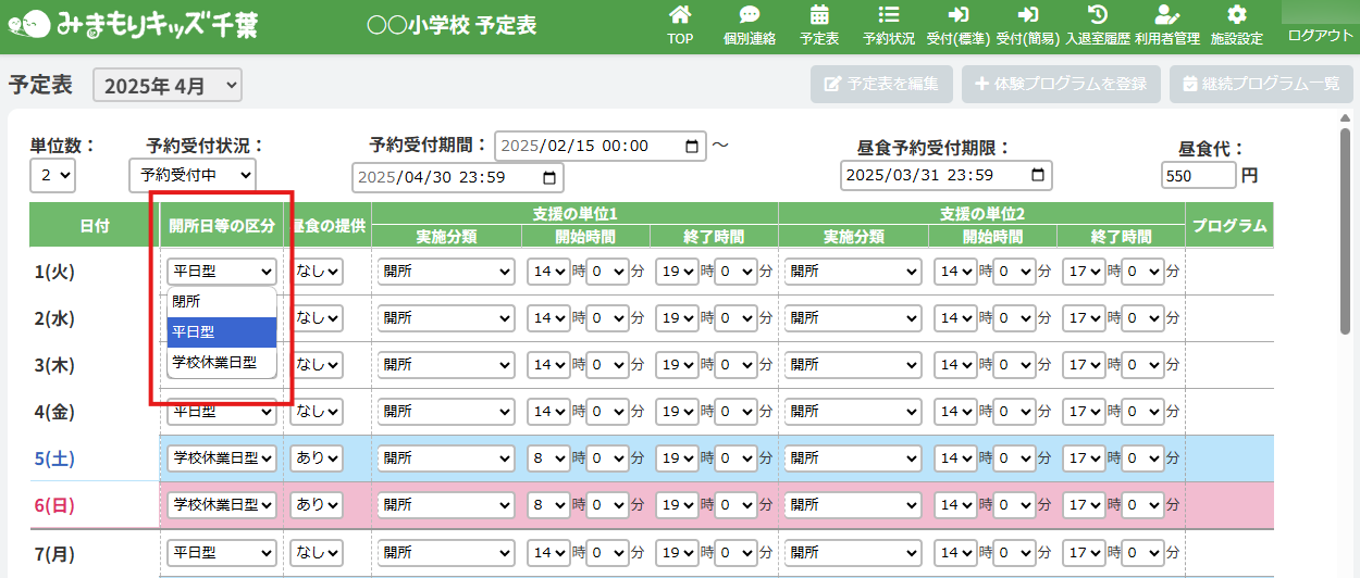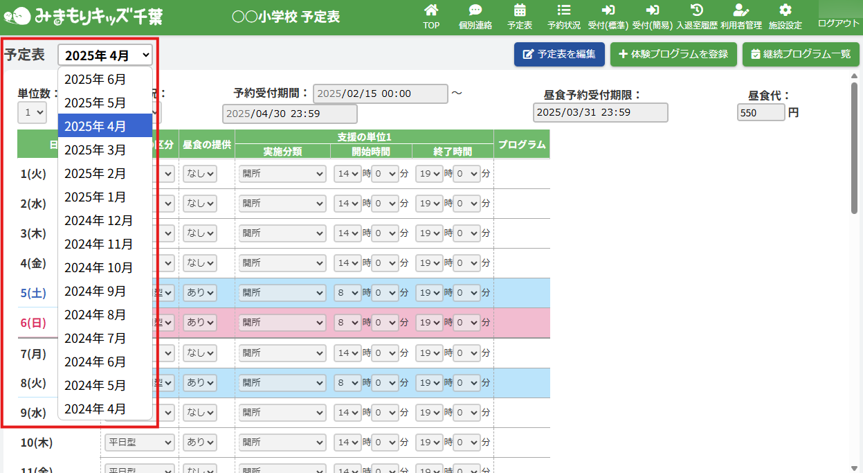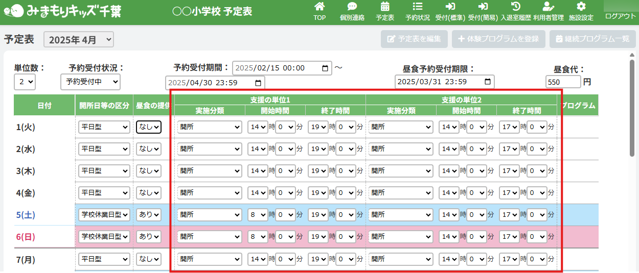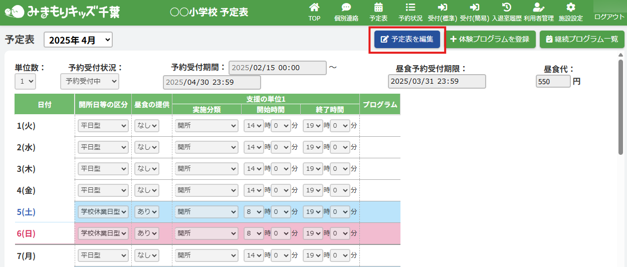 ※一度も予定表の編集を行っていないと「予定未設定」と表示され、保護者が利用予約できません。