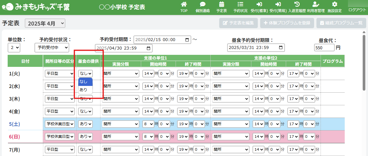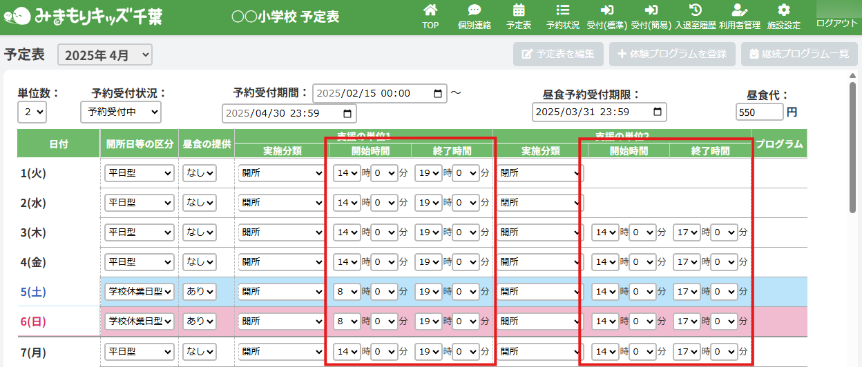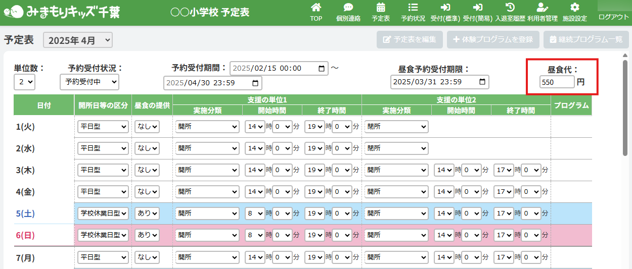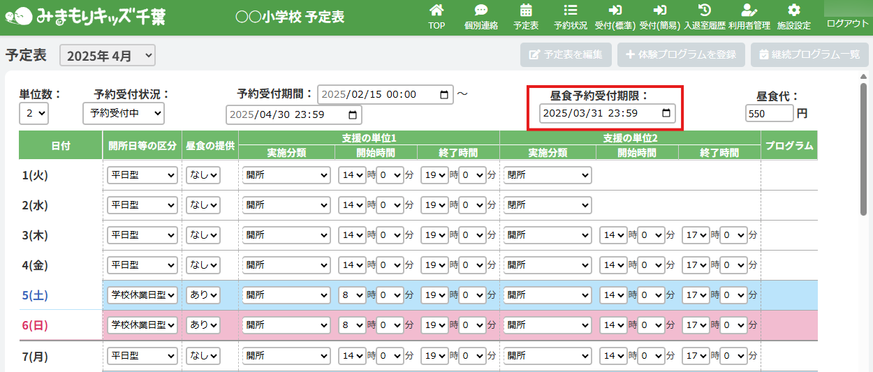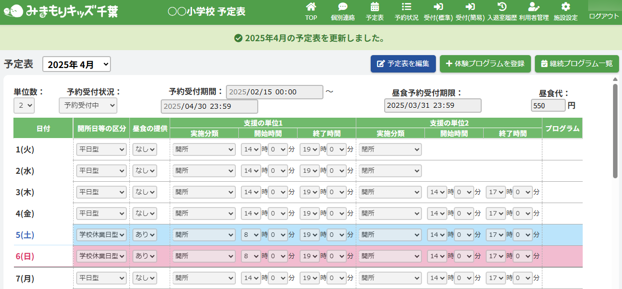 ※一度も予定表の編集を行っていないと「予定未設定」と表示され、保護者が利用予約できません。