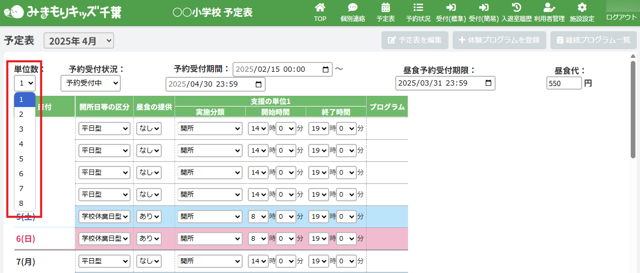 画面左上にある「単位数」からその月に開所する予定の単位数を選択してください。