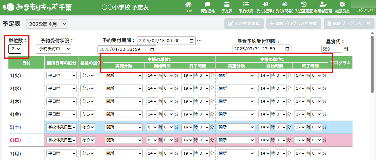選択した単位数に応じて、予定表の支援の単位の数が変更されます。