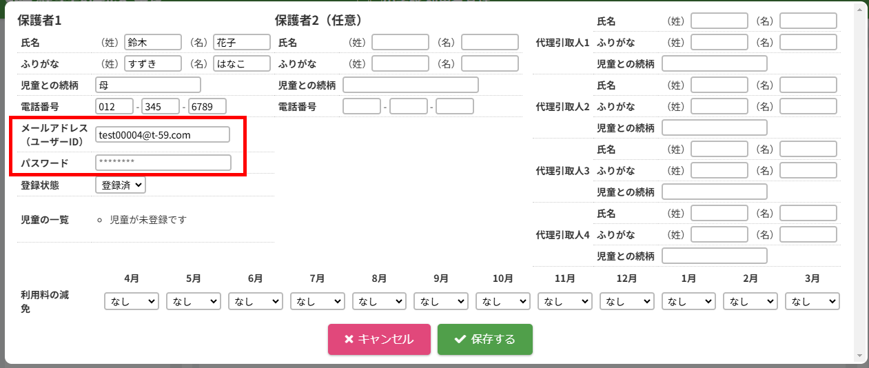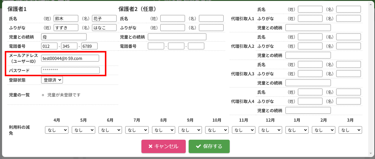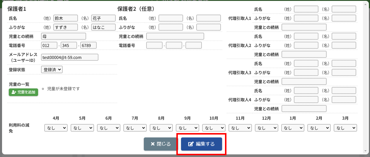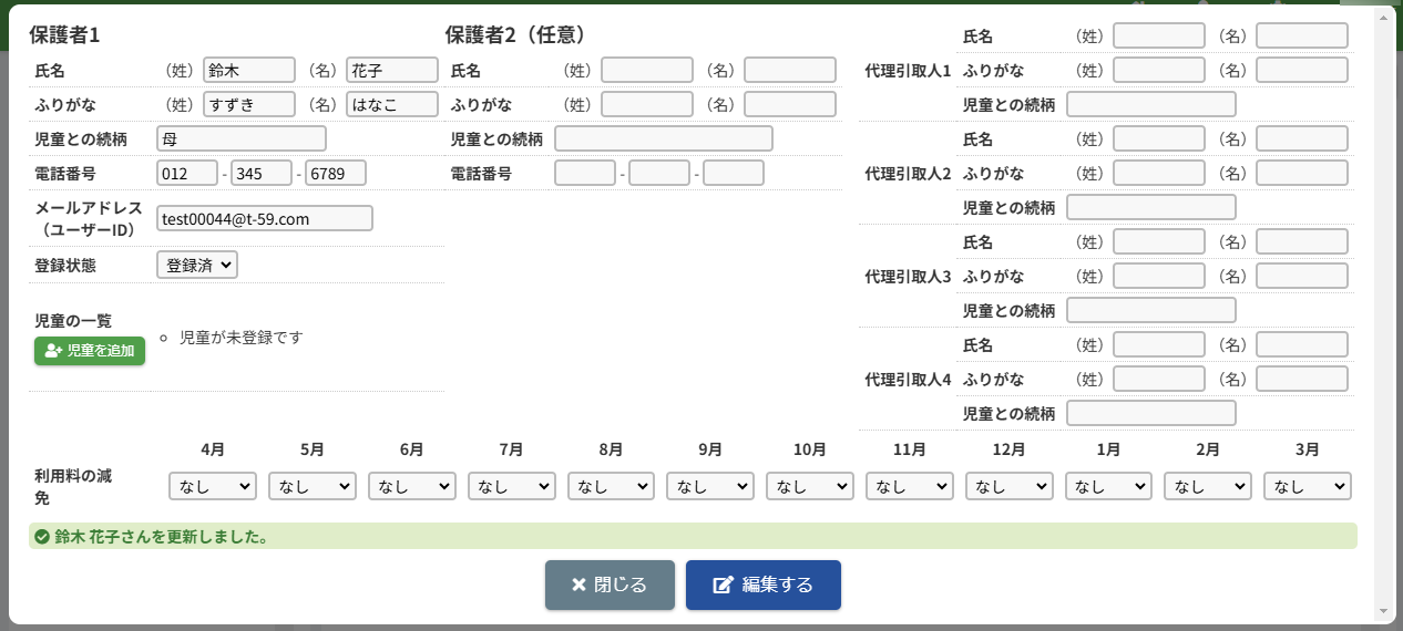 HOME > 利用者管理 > 保護者のユーザーIDやパスワードを変更する 保護者のユーザーIDやパスワードを変更する 「保護者のユーザーIDやパスワードを変更する」では、施設側で保護者が使用するユーザーID(メールアドレス)やパスワードを変更する 機能の確認ができます。 ※保護者側からは登録したユーザーIDの変更はできません。 1.保護者編集フォームを開く ユーザーIDやパスワードを変更したい保護者の氏名をクリックしてください。 2.保護者の登録内容の編集を実行する 【編集する】ボタンをクリックして、次へ進みます。 3.ユーザーIDやパスワードを変更する 各項目に沿って変更したい内容を入力してください。 パスワードの確認はできません。パスワードを変更する際は上書き入力してください。 4.変更を保存する 【保存する】ボタンをクリックして、次へ進みます。 5.ユーザーIDやパスワードの編集を完了する 【閉じる】ボタンをクリックして、ユーザーIDやパスワードの変更は完了です。 代理引取人を登録・変更する ≫
