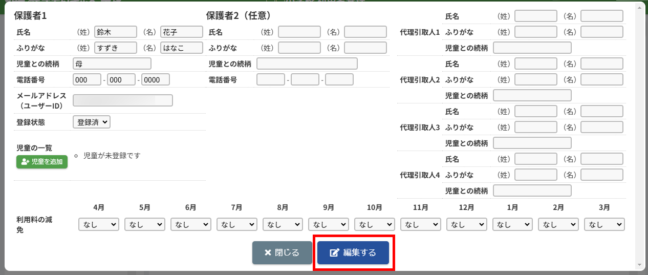 「保護者の登録内容を変更する」では、登録中の保護者情報を編集する機能の確認ができます。