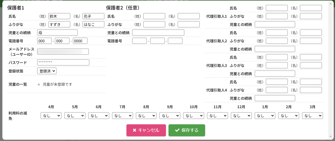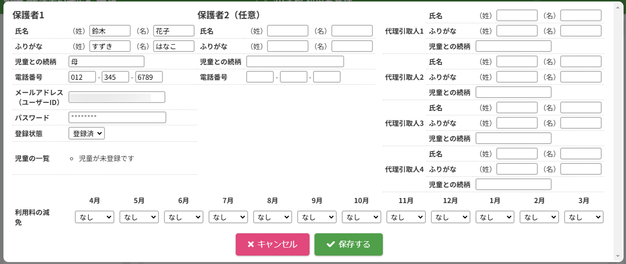 保護者のユーザーIDやパスワードの変更、代理引取人の登録、利用料の減免等を設定できます。