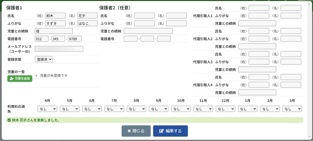 【閉じる】ボタンをクリックして、保護者登録内容の変更は完了です。