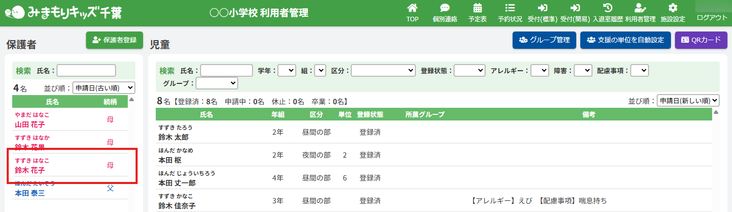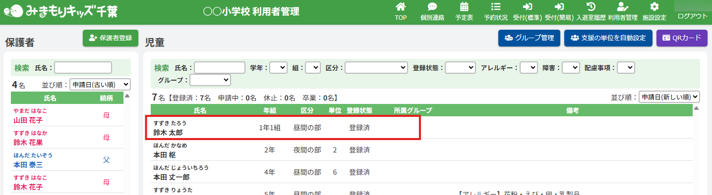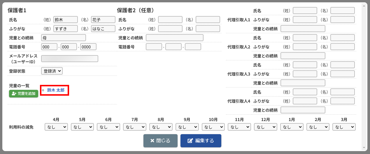 HOME > 利用者管理 > 児童の登録内容を変更する 児童の登録内容を変更する 「児童の登録内容を変更する」では、児童の登録内容を変更・編集する機能の確認ができます。 1.児童編集フォームを開く 児童の一覧から編集したい児童の氏名を選択してください。 <保護者編集フォームから児童の登録内容を変更する方法> 児童一覧からではなく、保護者編集フォームから児童編集フォームを開くこともできます。 (1)保護者編集フォームを開く 登録内容を変更したい児童の保護者の氏名をクリックしてください。 (2)児童編集フォームを開く 児童の一覧より編集したい児童の氏名をクリックしてください。 2.児童の登録内容の編集を実行する 【編集する】ボタンをクリックして、次へ進みます。 3.登録内容を変更する 項目に沿って変更したい内容を入力、選択してください。 4.児童の編集を保存する 【保存する】ボタンをクリックして、次へ進みます。 5.児童の編集を完了する 【閉じる】ボタンをクリックして、児童登録内容の変更は完了です。 <児童編集フォームから保護者編集フォームを開く方法> 保護者一覧からではなく、児童編集フォームから保護者編集フォームを開くこともできます。 児童編集フォーム内の保護者の氏名をクリックしてください。 保護者を編集する方法について、詳しくは下記の【保護者の登録内容を変更する】をクリックしてご確認ください。 保護者の登録内容を変更する ≫ 児童の登録内容の変更について、項目ごとにページを分けて説明しております。 詳しくは下記のリンクをクリックしてご確認ください。 児童の登録申請を承認する ≫ 支援の単位を設定する ≫ 平日利用希望日数を変更する ≫ 児童の利用を休止する ≫ 児童の利用を再開する ≫ 児童の登録を抹消する ≫ 児童の次年度継続を設定する ≫ 児童の登録申請を承認する ≫ 支援の単位を設定する ≫ 平日利用希望日数を変更する ≫ 児童の利用を休止する ≫ 児童の利用を再開する ≫ 児童の登録を抹消する ≫ 児童の登録を卒業に設定する ≫ 児童の次年度継続を設定する ≫ 児童の登録申請を承認する ≫