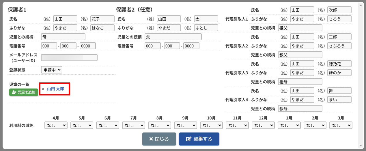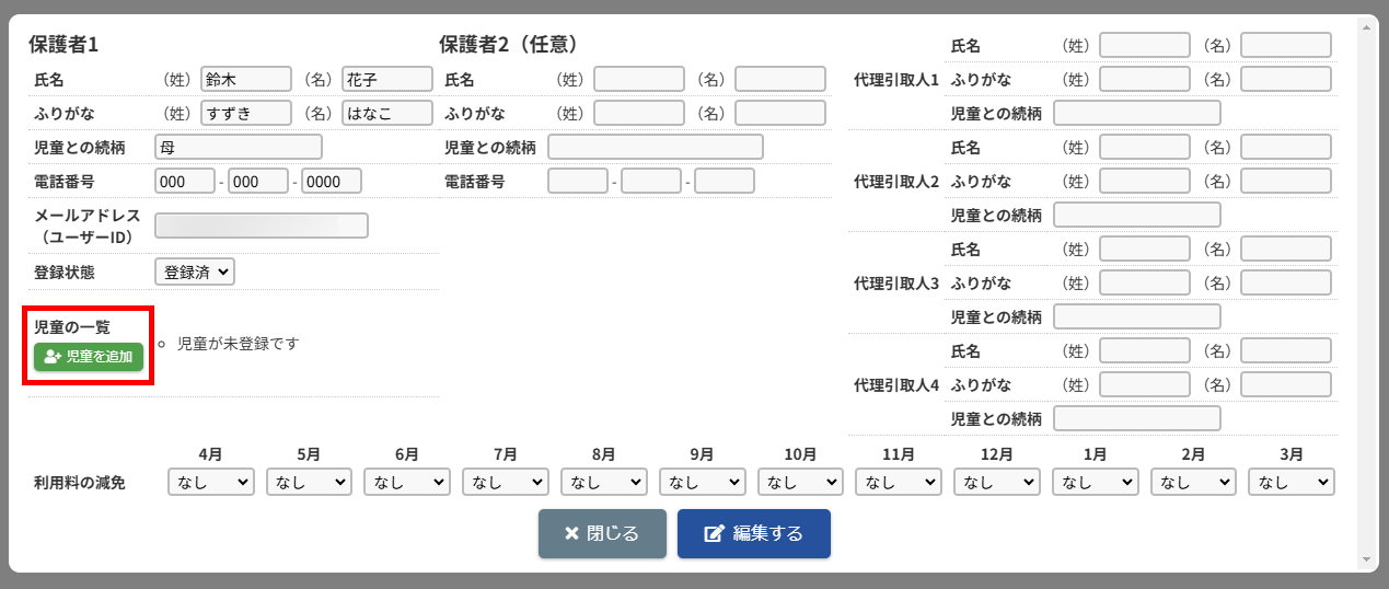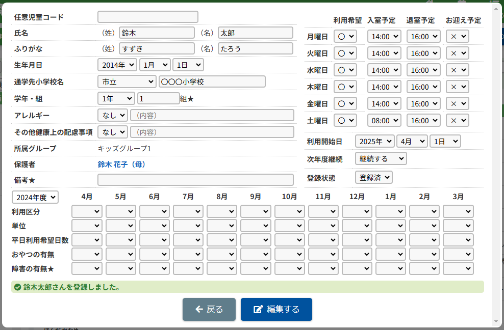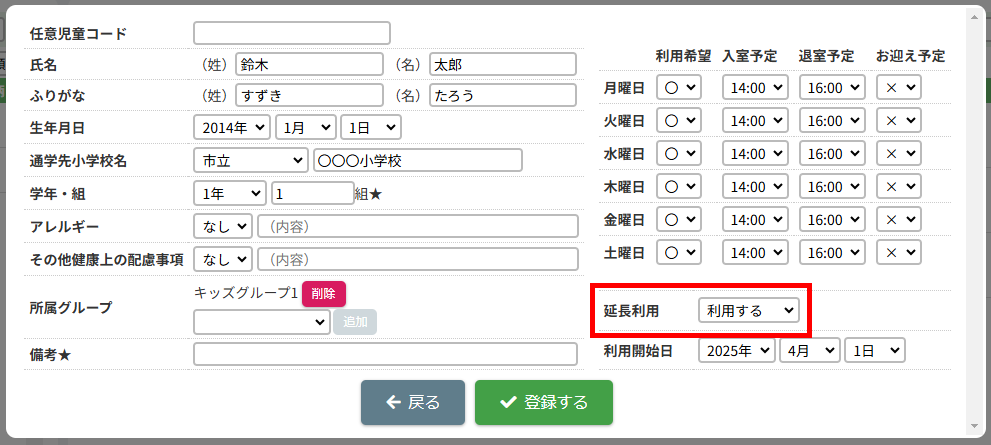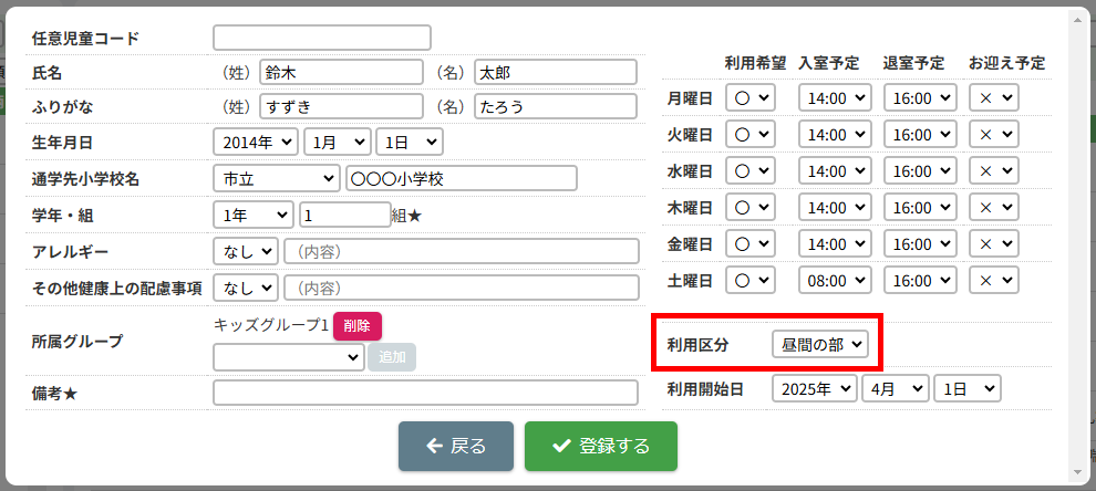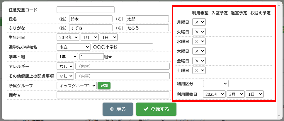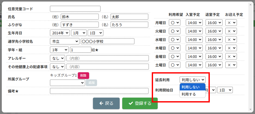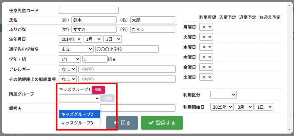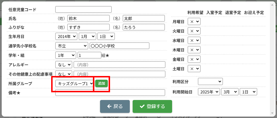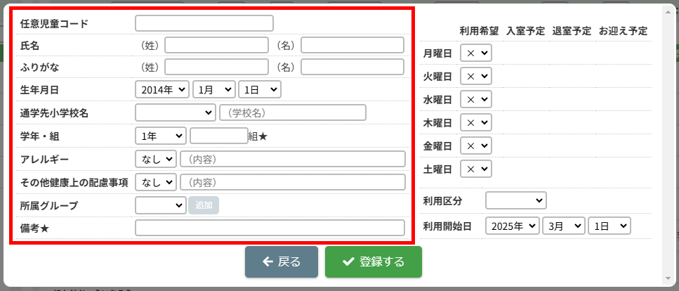 HOME > 利用者管理 > 児童を登録する 児童を登録する 「児童を登録する」では、施設側で児童情報を新規登録する機能の確認ができます。 ※施設側から児童を登録した場合は「登録状態」が「登録済」になります。 1.保護者編集フォームを開く 児童を登録したい保護者の氏名をクリックしてください。 2.児童を追加する 【児童を追加】ボタンをクリックし、登録内容入力欄へ進みます。 画像の例は、保護者に対してほかの児童が未登録な場合です。他に登録済みの場合は、一覧で表示されます。 <他の児童の登録がお済みの方> ご兄弟など他の児童を登録済みの場合は、一覧で表示されます。 3.登録内容を入力する 〇氏名・ふりがな・生年月日など、各項目を入力してください。 〇障害の有無は活動日誌や月別状況報告書(月報)に集計されるため、障害を持っている児童は必ず分類される項目を選択してください。 〇★マークのついている項目はセンシティブな内容を含むため、保護者側には表示されません。 〇所属グループは、児童が所属するグループを選択し、【追加】を押してください。複数グループを追加することも可能です。 〇曜日ごとの利用希望・入室予定・退室予定・お迎え予定・利用区分(子どもルームでは延長利用)・利用開始日を設定できます。 ・利用区分は児童が所属している区分【昼間の部】・【夜間の部】のいずれかを選択してください。 ・利用希望の曜日数は「対象児童」の計算で扱います。 <子どもルームでの画面表示> 児童登録の際の「利用区分」は、子どもルームとアフタースクールとでは表示が異なります。 子どもルームでは「延長利用」と表示されておりますので、延長利用をする場合は【利用する】、しない場合は【利用しない】を選択してください。 4.児童の登録を実行する 【登録する】ボタンをクリックして、次へ進みます。 5.児童の登録を完了する 【戻る】ボタンをクリックして児童登録は完了です。 ※施設側から児童を登録した場合は「登録状態」が「登録済」になります。 児童の登録内容を変更する ≫