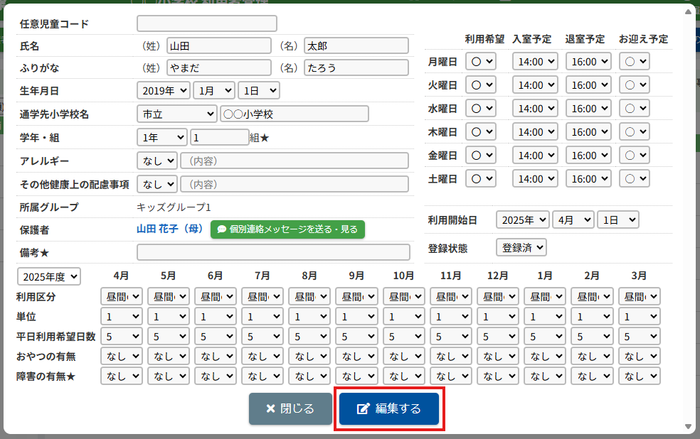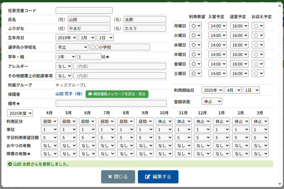 【閉じる】ボタンをクリックしたら、児童の利用の休止は完了です。