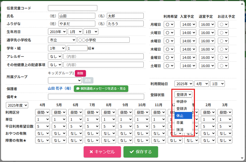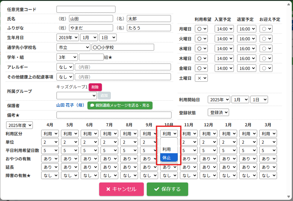 翌月以降から休止の場合、登録状態は変更せず、休止する月利用区分欄の選択肢から「休止」を選択してください。