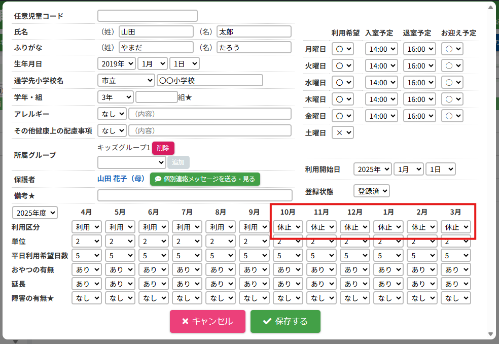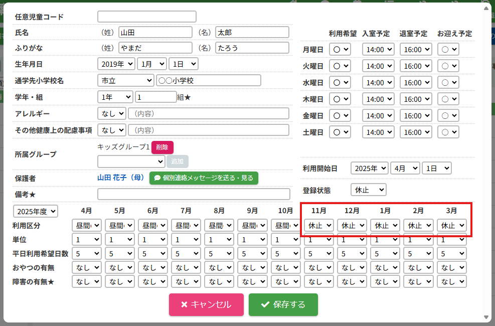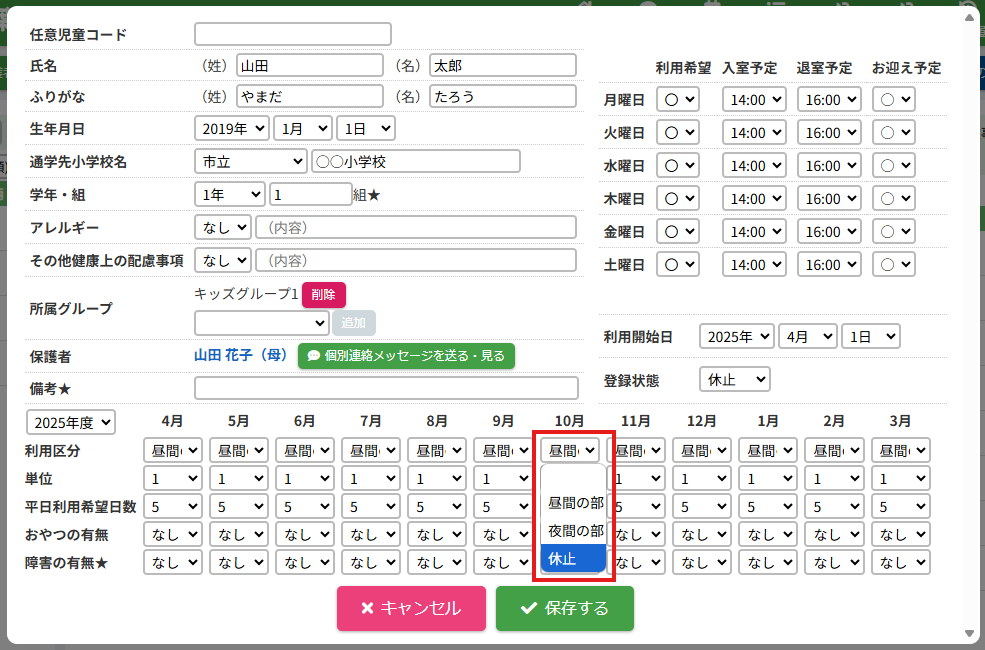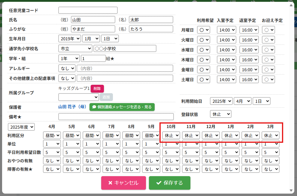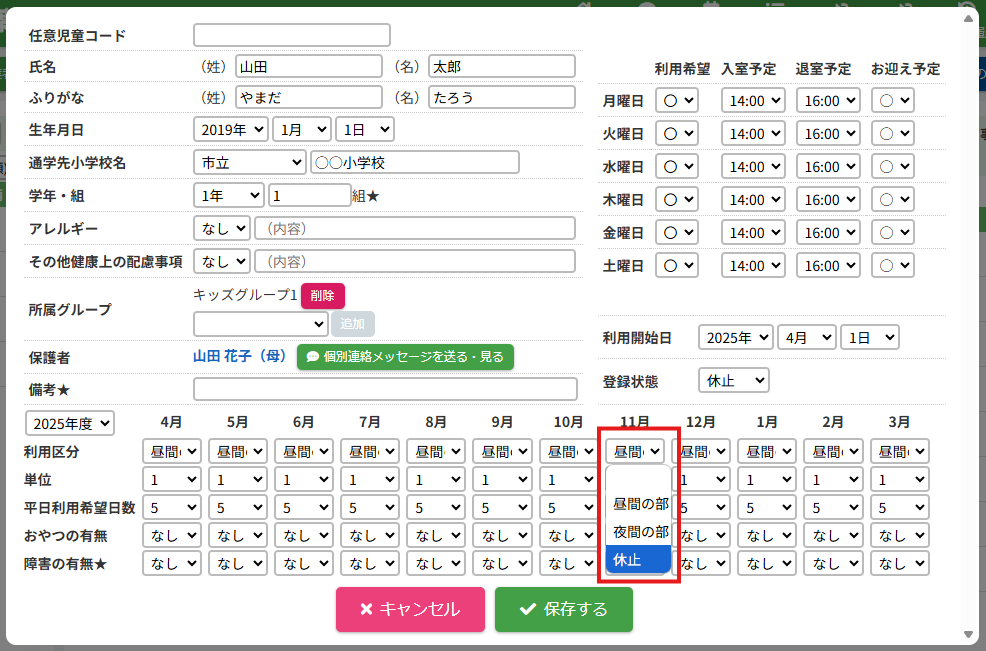 保護者の利用を休止する際は、まずその保護者の全ての児童の利用を休止してください。